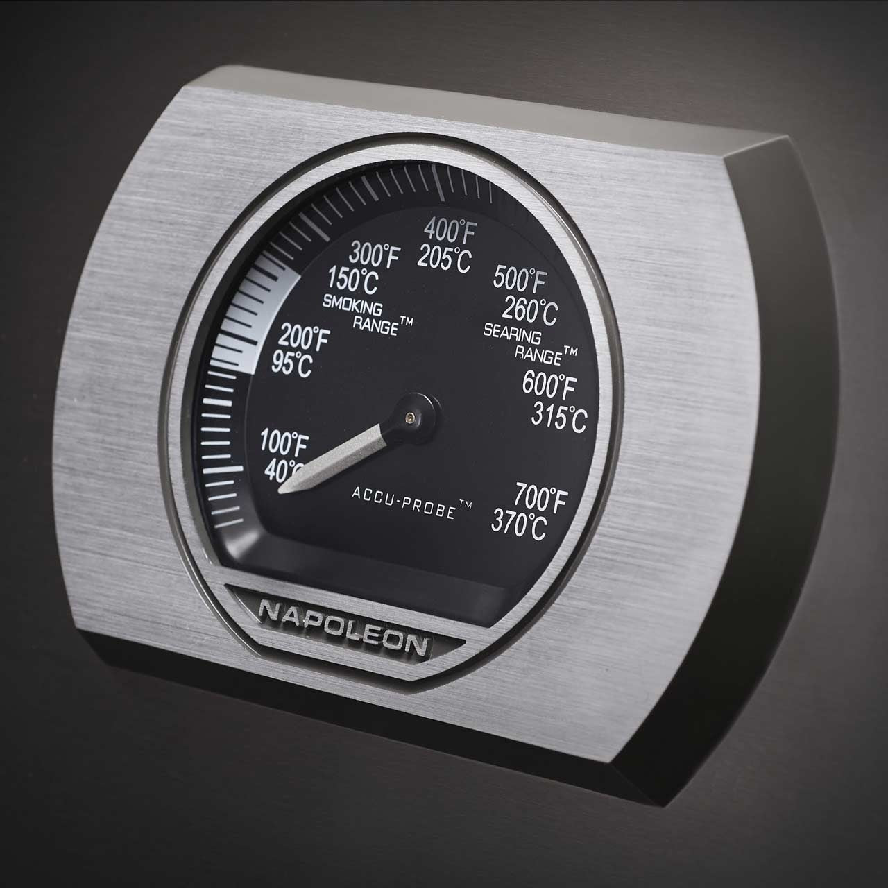 Das ACCU-Probe™ Deckelthermometer ist auch ein wiederkehrendes Feature bei den Napoleon-Grills und ein zuverlässiger Partner beim Grillen. Es zeigt die Temperatur im Garraum an, womit Du zu jeder Zeit die Kontrolle über Deinem Grillgut hast und es nicht verbrennt. Der Deckel ist die platzsparende LIFT EASE™ Rollhaube, diese kann man wesentlich leichter anheben und fällt nicht so weit nach hinten wie andere Grillmodelle.
