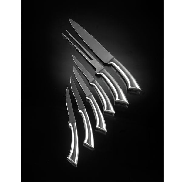 Das Set besteht aus vier hochwertigen, aus Edelstahl gefertigten Steakmessern, sowie einem zwei-teiligen Tranchier-Set.
