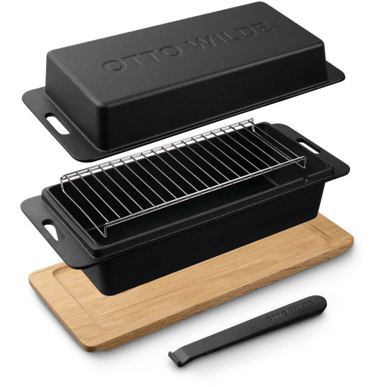- Einfach zu handhaben: Dank des im Set enthaltenen Gusseisenhebers kannst du die Bräterhälften sicher und einfach handhaben. Der Holzuntersetzer schützt zudem deine Arbeitsflächen.