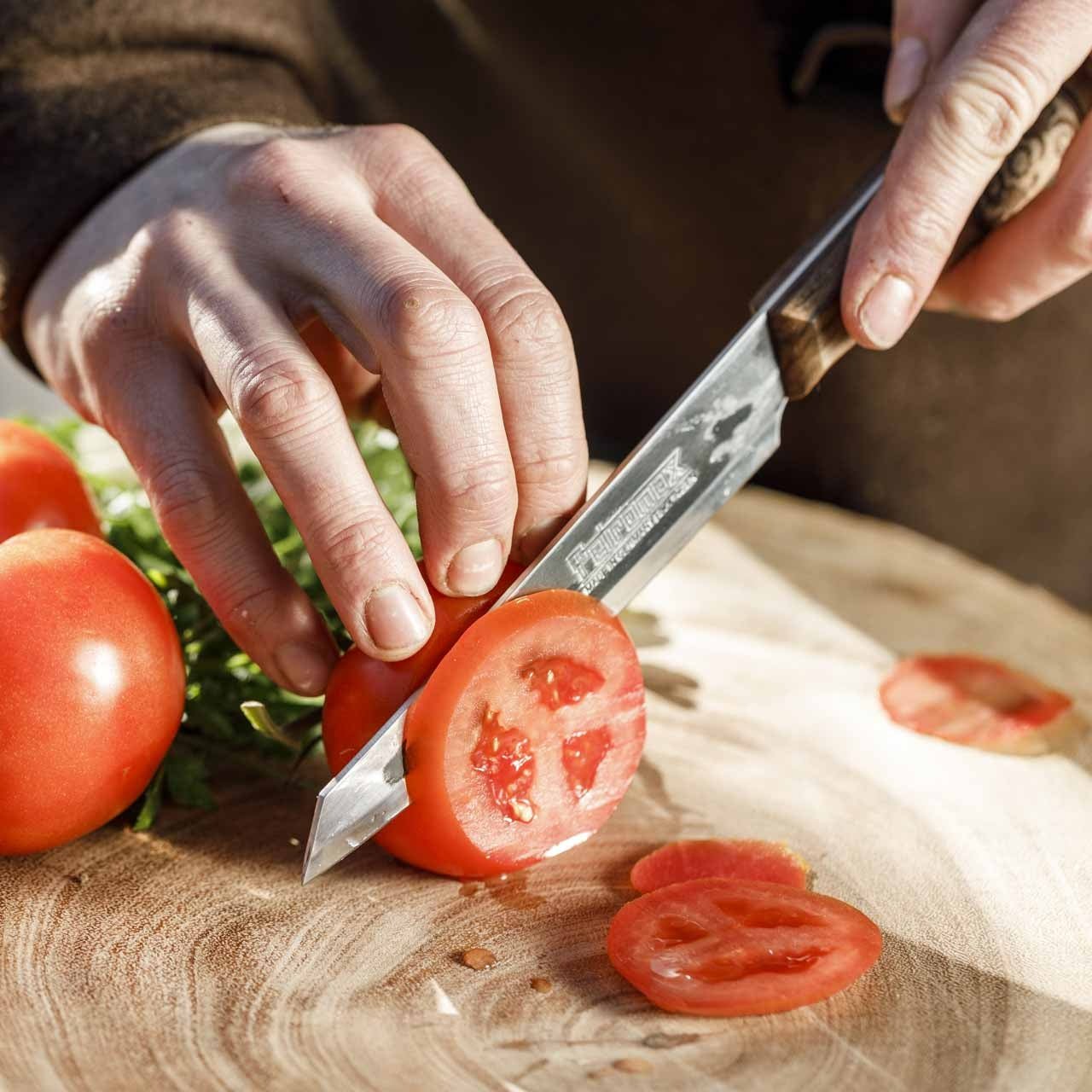 Das Petromax Allzweckmesser ist, wie der Name eventuell vermuten lässt, ideal für den täglichen Gebrauch mit seiner handlichen Klingenlänge von 14 cm. Perfekt für das Hacken von Kräutern, das Schneiden von Tomaten oder auch das Fett abtrennen von Fleisch.